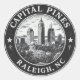 Black-and-white circular stamp-style illustration of the Raleigh, North Carolina skyline. The PNC Plaza and Wells Fargo Capitol Centre rise above the treetops, while the historic State Capitol dome anchors the foreground. Gentle Carolina pines and faint rolling hills fade into a soft background haze, all encircled in a Southern-inspired vintage badge with subtle flourishes. The phrase “Capital Pines” arches above, while “Raleigh, NC” grounds the design in an elegant serif font.