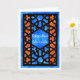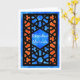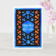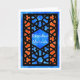 A Ramadhan Greeting card with a traditional Islamic Lattice pattern in black on a blue and orange background. The text in the central pane; is in white and reads, 'Ramadhan Mubarak'. Design handpainted in watercolors by Judy Adamson. The inside is left blank for your own message.