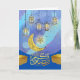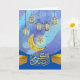 Ramadan Kareem greetings for Ramadan. Lanterns at night above a crescent moon and glowing star. Watercolors mixed with black pen and splashes of gold metallic tones. Customise the text inside as you like. Art, image, and verse copyright Shoaff Ballanger Studios, 2022.