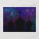 Magical night sky with pink and teal clouds and a crescent moon behind a mosque for Ramadan.