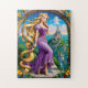 Rapunzel from a fairy tale. She stands in an arched stone doorway adorned with colourful flowers. Her long, flowing blonde hair cascades down, and she wears a purple gown with floral embroidery. In the background, there’s a picturesque landscape featuring a distant castle atop a cliff and a waterfall.