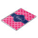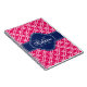 Raspberry pink white Moroccan lattice pattern with a navy monogram initial. On top of the bright pink and white trellis pattern is a navy blue and white label featuring a monogram letter and name template for you to customize.