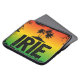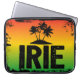 Tropical laptop case printed in the rasta flag colours of red, yellow and green, with palm tree silhouettes above the phrase IRIE