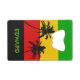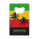 Tropical bottle opener featuring the striped Rastafarian flag, with black silhouette palm trees. The text front and back is totally customisable, so you can add your own message and names
