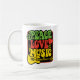 Retro-style type design of Peace, Love and Music with peace symbol, heart, guitar and musical notes in reggae colours.