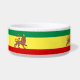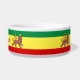 This pet bowl features a Rasta Reggae theme with the flag of Ethiopia of 1897 consisting of horizontal bands of green, yellow and red with a dark Lion of Judah at the centre, wearing a crown and holding a cross.