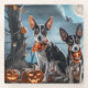 Unleash the spooky spirit with this eerie Halloween design featuring a pack of dogs under a dark, moonlit sky, surrounded by flying bats and glowing pumpkins. Perfect for those who love a touch of frightful fun with their furry friends!