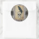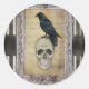 A dark gothic halloween image featuring a skull, a beautiful raven,  placed  in a vintage frame on a back ground of black and white stripes dressed with a grunge texture. © WickedlyLovely