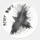 Creepy Halloween favour sticker with a black watercolor image of a scary looking crow or raven. Black text reads never more, and can be changed to read what you want. Matching Halloween party products are available.