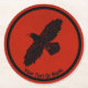 A simple, black silhouette of a Raven (Corvus corax) on a red, leather-look background image. The raven image has been given a slight "rough" or "worn" effect. Add your own text.