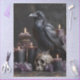 A raven perched on a human skull, surrounded by glowing candles and amethyst crystals.