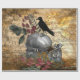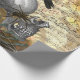 Raven crow on a skull. Spider creepily crawling upon broken skull. Vintage ephemera design with antiqued grunge background.