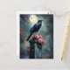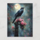 A striking raven stands on a moss-covered tombstone surrounded by vibrant pink roses, while the full moon illuminates the serene, mystical scene.