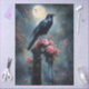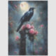 A striking raven stands on a moss-covered tombstone surrounded by vibrant pink roses, while the full moon illuminates the serene, mystical scene.