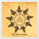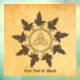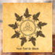 Nine lively ravens (Corvus corax) circle around a knotted Norse/Celtic ring. A triquetra, a triangular figure of three interlaced arcs, appears at centre. Everything is superimposed on an old paper background image, giving it a mediaeval feel. Customise by adding your own text.