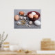 Raw eggs and garlic and spices on the kitchen table on the old grey textile background