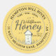 Central design features an illustration of a small backyard hive on a bright yellow background. The words Wildflower and HONEY are written in a script font. Text is printed in black and taupe. Personalise with your apiary name, address and honey description (raw, hand bottled, single source etc.). Also include your honey net weight. Common honey net weight conversions: 8oz (227g), 12oz (340g), 16oz (454g), 32oz (907g), 5lb (2.27kg).