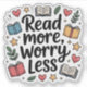 A playful doodle-style design featuring the hand-lettered phrase “Read More, Worry Less,” surrounded by open books, stars, leaves, and hearts. Perfect for book lovers, journalling enthusiasts, and anyone who finds calm and joy in reading.