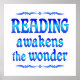 Promote reading and the exploring of new and wonderful discoveries with this shiny design saying - Reading awakens the wonder. Great for teachers and librarians.