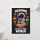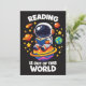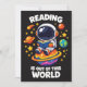 Reading is out of this world shows a cute astronaut sitting on a bright planet while reading a book in space. A playful space themed reading scene for book lovers, students and science fans who enjoy imagination and curiosity.