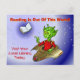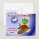 a fun and funny green space alien is featured on this library promotional card design. A shiny gold spaceship and a fun blue star-filled background complete the image. Customise by adding details about your library's reading programs, special events, hours of operation, or anything else you can think of. Great promotional tool for your library. Enjoy Reading!