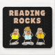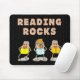Reading rocks text with three happy rocks holding and reading books is a funny literacy gift design for book lovers, librarians, school literacy teachers and students.
