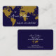 Business card for a travel agent... with the image of a faux golden (ochre colour simulating gold) map of world on a deep blue background with name printed in handwritten font style... and with custom words 'ready for new adventures?'