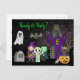 A cool and affordable way to invite people to your Halloween party! The front of the invitations is a cute black cat hiding in a pumpkin, a haunted house, cartoon witch, vampire, mummy and bat. Add your party's information onto the back of the postcard in the personalise area.