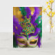 Funny Mardi Gras partying card with masquerade mask with feathers and beads in green and purple.