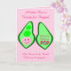 This beautiful greeting card features a graphic image of a green Pea pod containing 2 green peas and a big pink pea. The large pink pea has a cute little face with eyes and a mouth. On the other side of the pea pod in darker pink text it says "Baby Girl Ready to Pop".