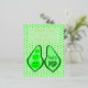 This awesome foil postcard features a graphic image of a green Pea pod containing 3 green peas. The largest pea has a cute little face with eyes and a mouth. On the other side of the pea pod in darker green text it says "Ready to Pop".