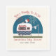 Ice pop themed gender neutral baby shower with illustration of camper with red white and blue ice pop on top, with baby clothes hanging on line, and fireworks in the sky.