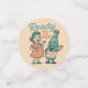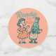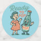 "READY TO POP!" This absolutely charming retro 1950s-inspired design features a sweet pregnant woman in a coral polka dot dress standing next to a cheerful anthropomorphic soda pop bottle—both ready to pop! The vintage cartoon aesthetic, warm nostalgic color palette, and playful pun create the perfect celebration of expectant motherhood.