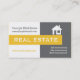 Real estate grey, white, yellow eye-catching business card featuring a little house in white on grey, white background and a yellow band with the text Real Estate. A great professional business card for the realtor.
