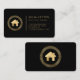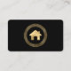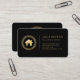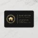 This real estate business card features a faux gold house logo framed by a circular Greek key motif on the left and simple, gold colored sans serif text on the right, with a vertical line between, on a black background with rounded corners. A larger version of the house logo appears on the reverse side.