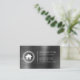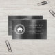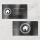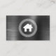 This real estate business card features a white house logo framed by a circular Greek key motif on the left and simple white sans serif text on the right, with a vertical line between, on a charcoal grey brushed metal background. A larger version of the house logo appears on the reverse side.