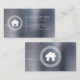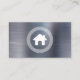 This real estate business card features a white house logo framed by a circular Greek key motif on the left and simple white sans serif text on the right, with a vertical line between, on a silver brushed metal background. A larger version of the house logo appears on the reverse side.