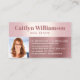 Present your best self to your clients. A simple, pink rose gold brushed foil metallic, modern house icon and bold, white typography on pink rose gold brushed foil metallic band overlay a soft shimmer, light pink faux foil ombre metallic background on the front of this chic, elegant, graphic business card. Your custom photo is on the back. Personalise with your full name and business on the front. Fill in the back side with the photo of your choice, phone numbers, address, email, website, and social media accounts. Makes a chic, professional, and stylish statement wherever you go. Additional coordinating real estate supplies such as folders, clipboards, planners and more are also available in this collection.