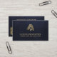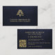 Professional, elegant realtor real estate agent modern minimalist luxury upscale dark navy blue leather look (PRINTED) business card with faux gold metallic house and key logo and custom scannable QR code for contact, evaluation, or to see listing.