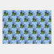 Blue floral wrapping paper sheets. Each sheet has a pattern of realistic, light blue hydrangea flowers, with green leaves. The background colours are light blue, dark green and pale blue.