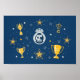 Wall art: A design reflecting Real Madrid's history by featuring small icons representing major championships. Golden trophies and stars are spread across a sophisticated blue background, with the logo subtly centred