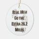 A gift for runners that says Real Men Go The Extra 26.2 Miles in dark brown with a faded pair of running shoe prints in the background. A cute 26.2 t shirt and more funny running shirts and gifts for the guy who is training for a marathon or has completed his first race.