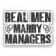 Show your admiration for strong and organised relationships between managers and their loving partners with our funny quote "Real Men Marry Managers". Funny gift idea for your Wife or girlfriend.