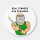 This funny woodturning design has a burly cartoon guy with a scowl, holding a sharp chisel. It reads, "Real Turners Use Scrapers."