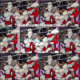 Original whimsical painting of Holiday Dollys by well-season Fine Art Artist, Gaye Elise Beda. A gathering of anthropomorphic mice is dressed in festive, holiday-themed clothing. Their bright red outfits and striped socks create a joyful and playful scene, with each mouse uniquely adorned. The background suggests a wintry setting, enhancing the festive mood.
