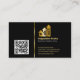 Professional real estate business card featuring a bold black background, gold accent line, and a stylish gold house logo. The design includes a space for your photo and a scannable QR code, perfect for directing clients to your listings, website, or digital portfolio.