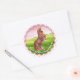 Add a special touch to a young girl’s birthday celebration with these personalized horse-theme stickers. Featuring an illustration of a golden palomino pony frolicking in a lush green pasture with customizable text. A trendy pink scalloped edge border and playful polka dots complete this design. Modify the text with your own sentiment to create a set of one-of-a-kind stickers to add a personal touch to gifts or favor bags.