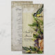 Matching Formal Dinner Reception Menu Card. COLOR PALETTE: yellow, tan, cream, orange, green, and black. DESIGN: This antique vintage typography inspired wedding invitation set or collection has a complete ensemble of products and has been created in several colorways. Using vintage printer's ornament decorative swirls from the baroque Victorian era, mixed with postcard flower art including lily of the valley, english violets, roses and snap dragon blossoms. A pair of yellow song birds with an open bird cage completes the front of the invite. The reverse side includes your text, which is easily customised using the template fields for personalising. There are more swirled flourish designs, swirled line work, aged, grunged border edges and the birdcage and roses. This is a mix of vintage design elements and original watercolor backgrounds graphically designed into new art work by Audrey Jeanne Roberts.