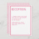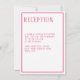 Generally used for formal dinner receptions being held at a separate venue location or with a restricted guest list. This card coordinates with the wedding invitation suite . Easily customise your information in our simple template. You can custom colour the border, font and background colour pattern using the simple tools provided. Shown in bright, rich pink. Modern, simple styling with a serif, all cap font design.