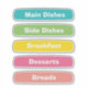 This sticker sheet includes popular section labels such as Main Dishes, Side Dishes, Breakfast, Desserts, and Breads—perfect for creating clear binder chapters and keeping your cookbook tidy.